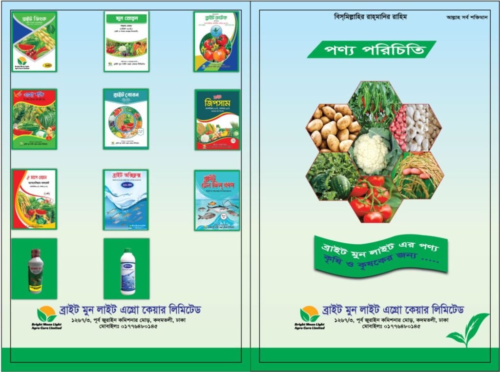 ব্রাইট মুন লাইট এগ্রো কেয়ার লিমিটেড সর্বোচ্চ গুণগতমানের সার, কীটনাশক ও অন্যান্য কৃষি পণ্য সরবরাহ করে থাকি, যা কৃষকের ফসলের বৃদ্ধি ও সুরক্ষায় গুরুত্বপূর্ণ ভূমিকা পালন করে। আমাদের পণ্যসমূহের মধ্যে রয়েছে: